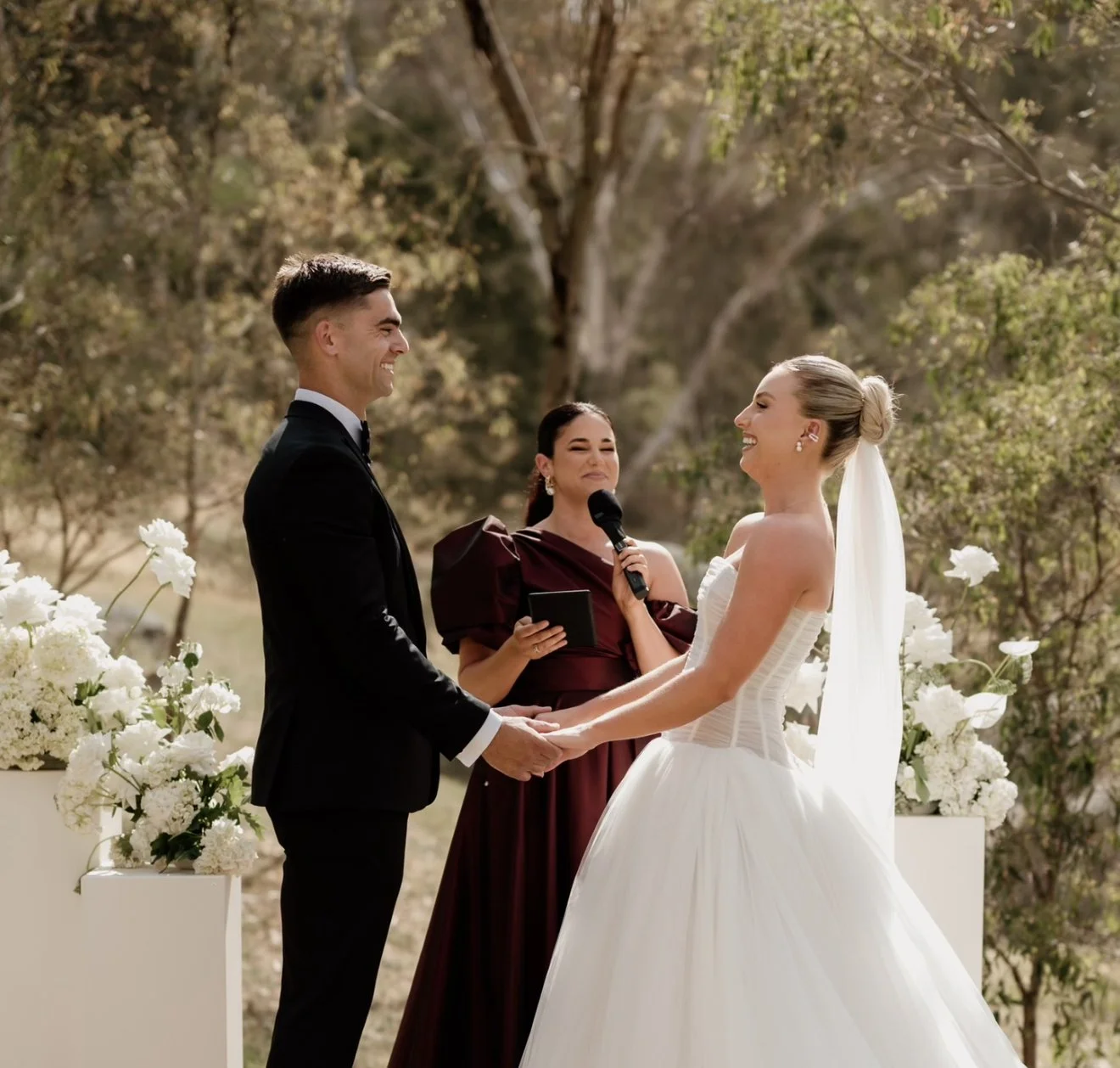 “Some couples choose their wedding date based on a venue, or perhaps the weather. We chose ours based on Jess’ schedule. It was hands down the best decision we could’ve made for our day. To have her by our side as we declared our love for each other was one of the greatest privileges of our life. Jess puts her whole heart into everything she does. Crafting a memorable - and moving - ceremony for us was no different and it exceeded anything we could’ve expected. We already knew she had mastered the art of storytelling through her decade long career in radio. But it’s clear when Jess is given the privilege of marrying two people - she treats it with the gravitas it deserves. She is warm, she is witty and she marries sincerity with humour in a way I still can’t comprehend. And she does it without making it all about herself. Jess might be a performer - but when she is in celebrant mode - the show is all about you. It’s a hard task to find someone who is equal parts emotional and entertaining. I think Jess achieves this because a) she’s naturally hilarious but b) she CARES. As a woman in my 30s, it will surprise no one to learn that I’ve been to dozens of weddings and can attest to the fact most celebrants have a formula they seem to reel off like a teacher who is writing reports. Copy. Paste. Change a few names. Every word of Jess’ ceremony comes from her heart. They come from hours of pouring over the couple’s answers, picking your brain and the brains of those you love. She will make you cackle, cry, and question “how did she know that” and somehow make you fall deeper in love with the person standing across from you. One year on and our wedding guests are still raving about her energy and warmth.
