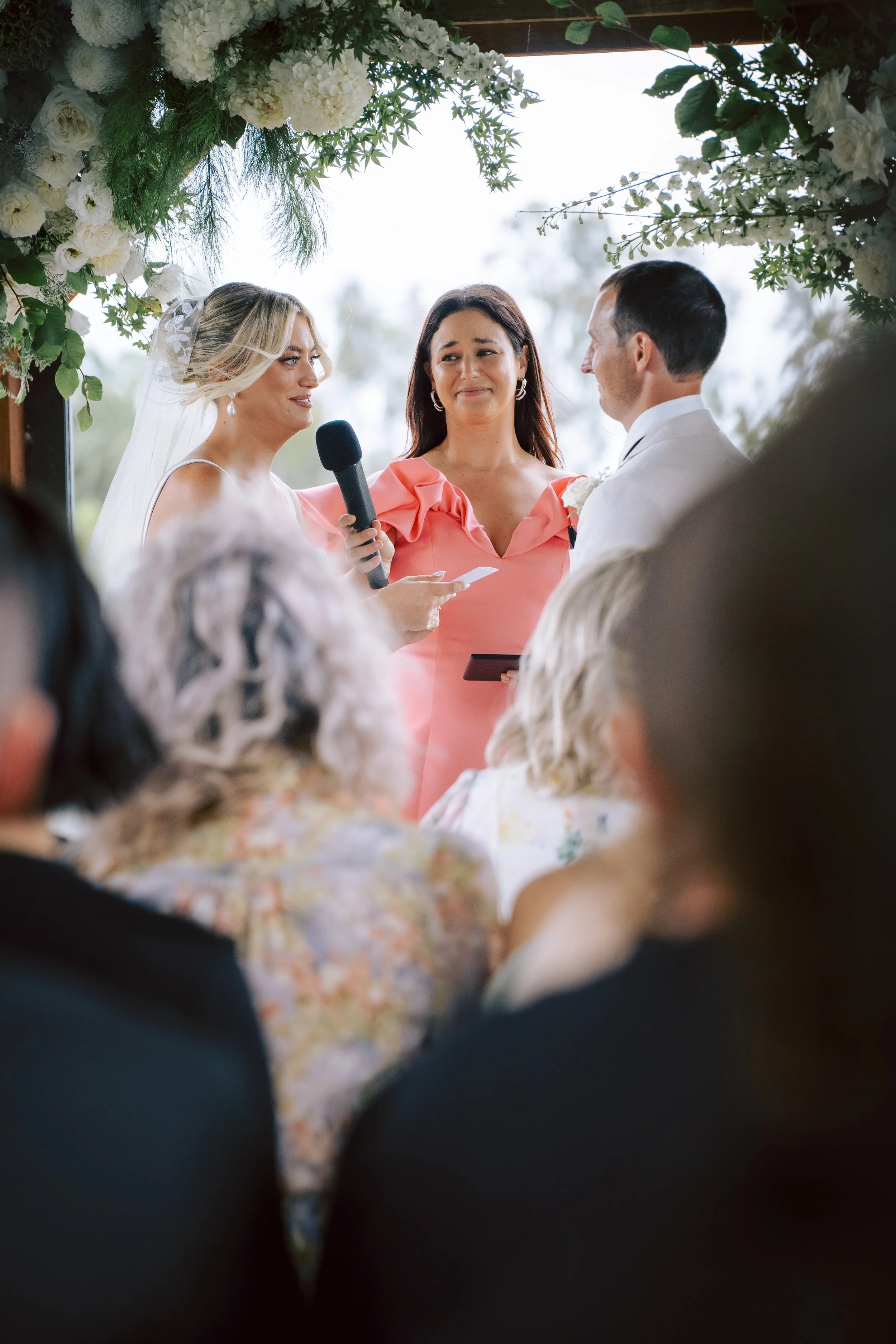 When we first started dreaming of how our wedding day would begin, how the ambience would be set and how our story would be shared, we thought of nothing other than Jess. There were no choices to be made, just a question to ask. Please, will you do us this HONOUR? Jess is magnetic. By that, I mean she not only draws in a crowd, she holds their attention with ease. Her vivacious energy, unrivalled charisma and effortless charm fills a space. Her joy is truly so irresistible that everyone in her orbit must choose the mood that she’s already in. We could not have wished to enter a warmer, safer or more welcoming atmosphere than the one Jess harnessed on our behalf. Jess’ storytelling is unmatched. Through questionnaires we answered separately and a few catch ups we had all together, Jess wrote a ceremony that perfectly captured us as individual characters, intertwined both our perspectives seamlessly, articulated not only the love we have but the life we’ve built and showed how important each of our guests were to us. We wanted our ceremony to be a celebration of us and our people and that’s exactly what she gave us. Jess’ ceremony was not only fun and full of personality, it was deeply moving. Her delivery was so compelling that our guests not only felt as though they were a part of our story, it was impossible to believe the rest of the world even existed while they were listening to it. Jess created such an emotional roller coaster that we (and our guests) were hanging on to every word for dear life. Our ceremony set the tone for the day that followed. It was fun, it was theatrical, it was romantic, it was full of heart, but most of all - it was us. We still receive compliments about Jess, which is completely and utterly unsurprising because the joy she gifts you is unshakable - her effect lasts a lifetime. I attended a wedding recently, where Jess was the Celebrant. The couple had booked her days after seeing our ceremony, as guests. As her number one fan, I was beyond excited to watch Jess take the stage once again. I felt as though I had the last tickets to a sold out show. A private performance with only 100 bodies allowed. A book being read by my favourite author, only I knew the main characters and I had lived some of the chapters. Let me tell you, she was everything I remembered and more. Her ceremony had me howling with laughter one minute, wiping away tears the next and smiling like a fool from start to finish. When I looked around to see the rest of the audience, I saw 99 other faces, moving in the same way mine was. Jess is more than a Celebrant, she is an Entertainer. She is A Force. She is A Moment. She is a Mood. If you want a celebration that is felt deeply in the moment and remembered long afterwards, Jess is a non-negotiable. Don’t think, just book.”